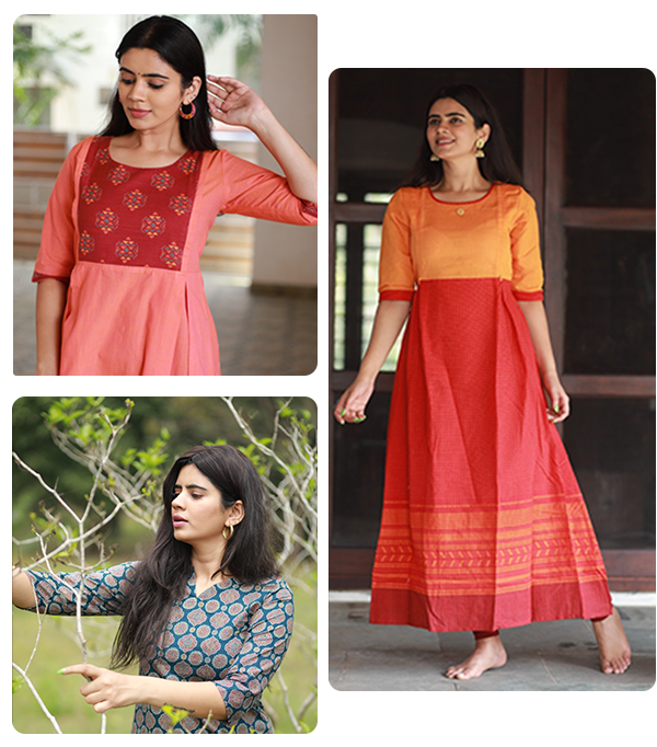 We also work with exclusive fabrics and prints like Tissue fabric, 100% hand-weaved cotton fabrics, Cotton Flex, Modal, Kalamkari prints, Digital print fabrics, etc for our unique design collections.